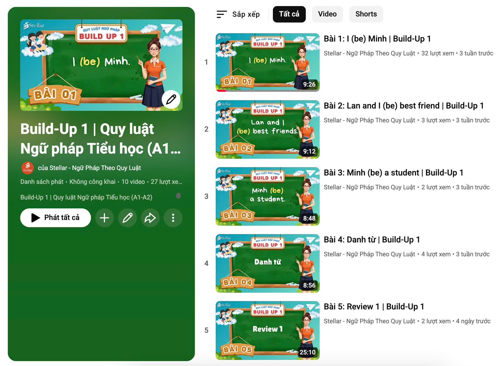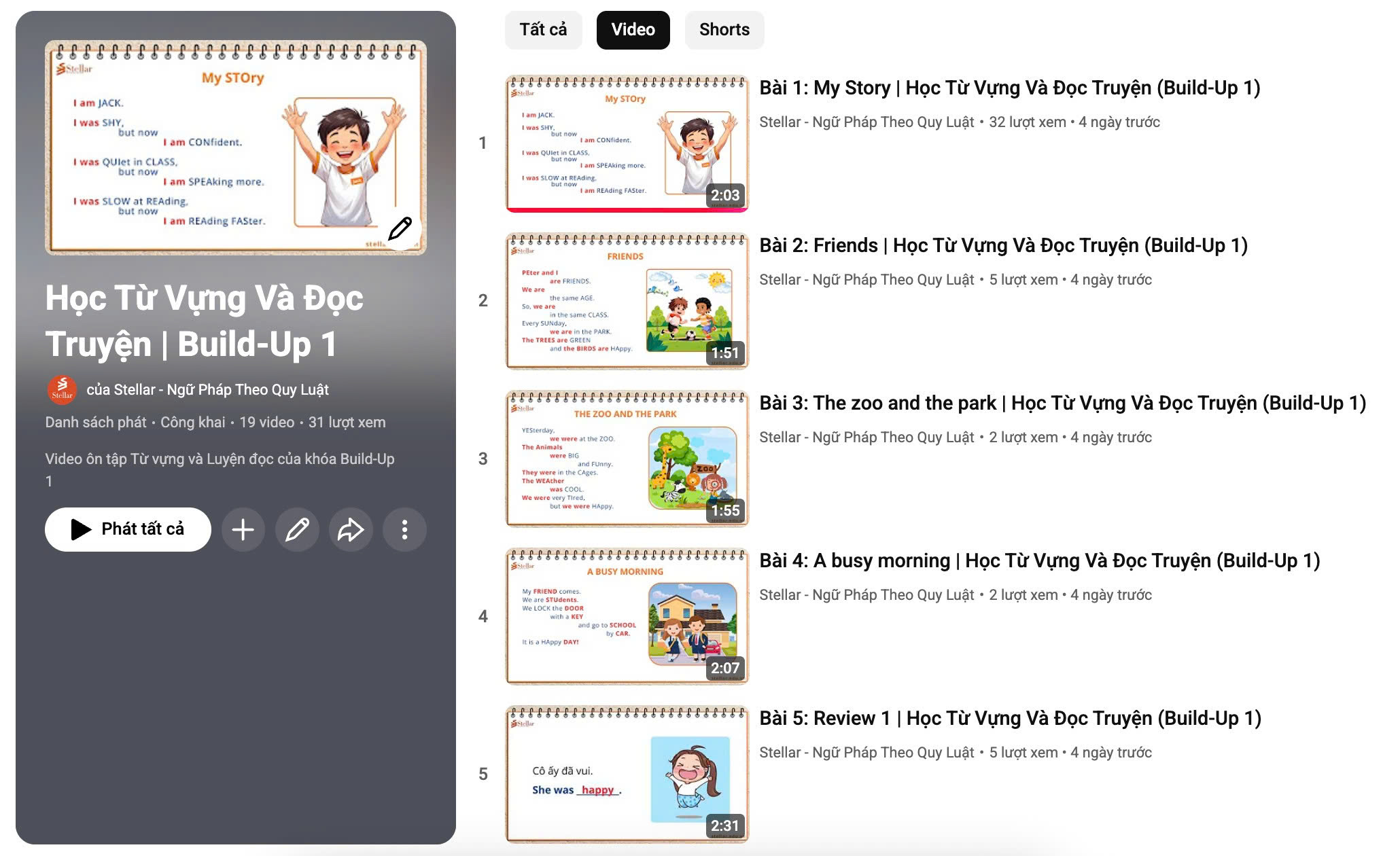 2️⃣ Mỗi bài học có 1 video bài giảng và 1 video đọc từ vựng, đọc truyện;